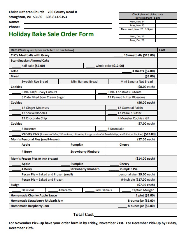 We are once again having our Holiday Bake Sale. Monies from this sale will go towards scholarships and funding youth mission trips. The youth are not the only ones baking for this Bake Sale. There have been many members of the congregation that have helped us out. We appreciate their sharing of their many gifts and talents to help us supply everyone with these lovely treats.