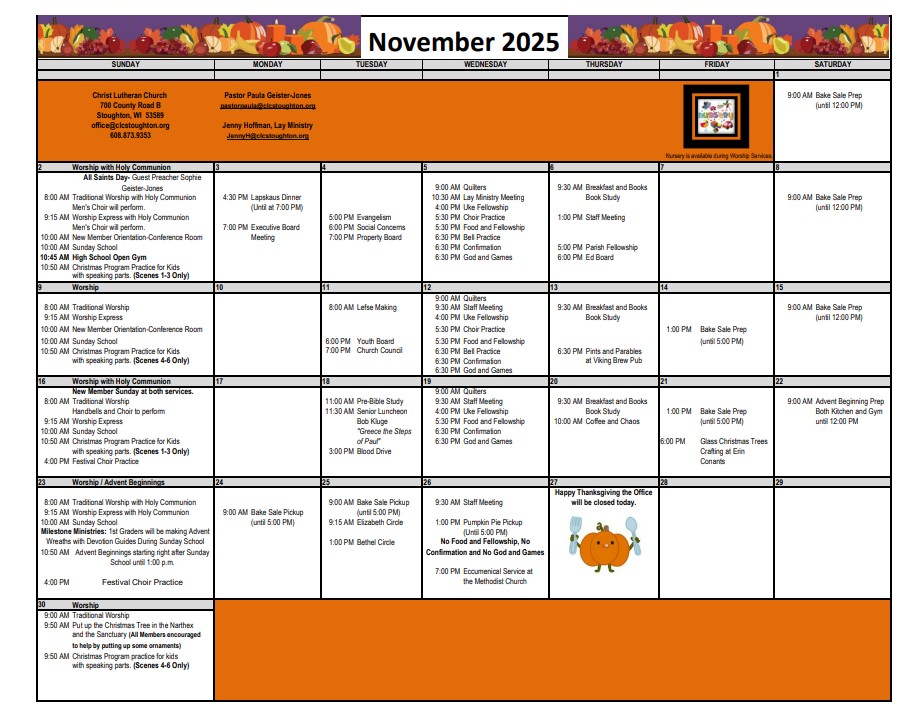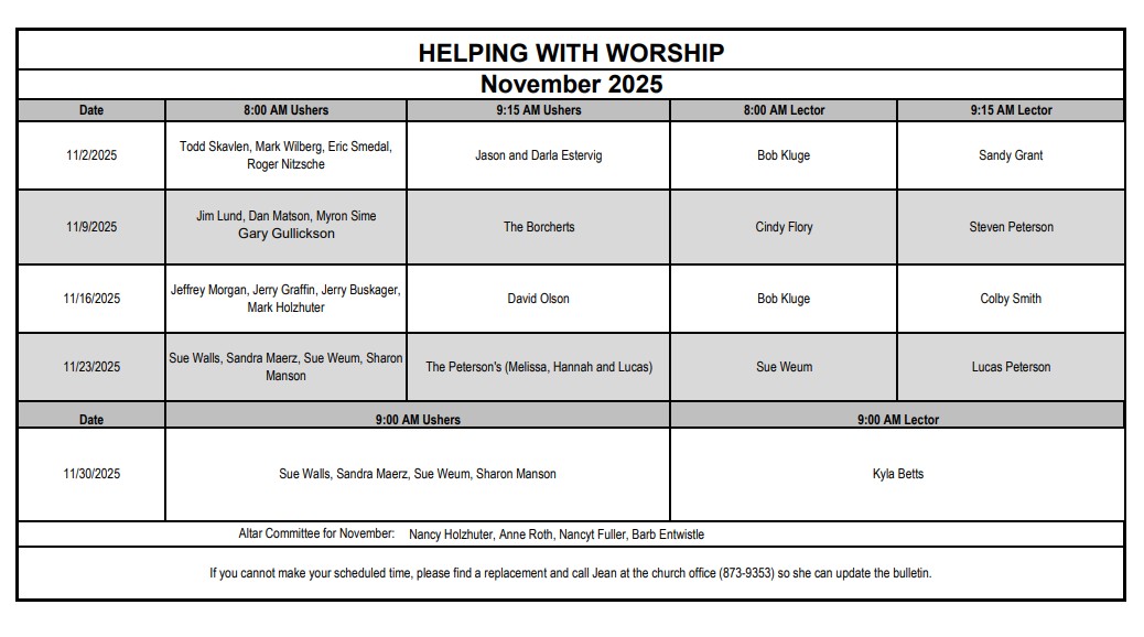 News/Schedules Click on image or words to open PDF November Calendar November Helping With Worship November Ambassador