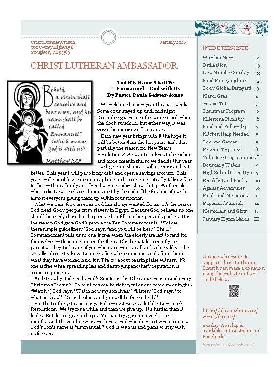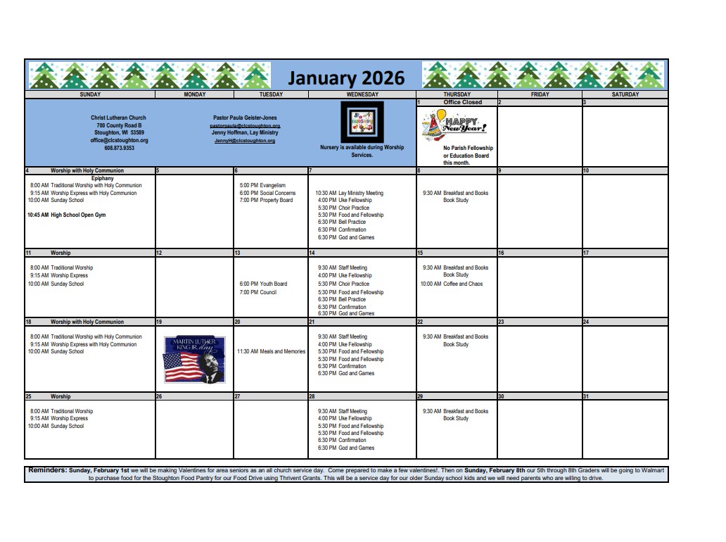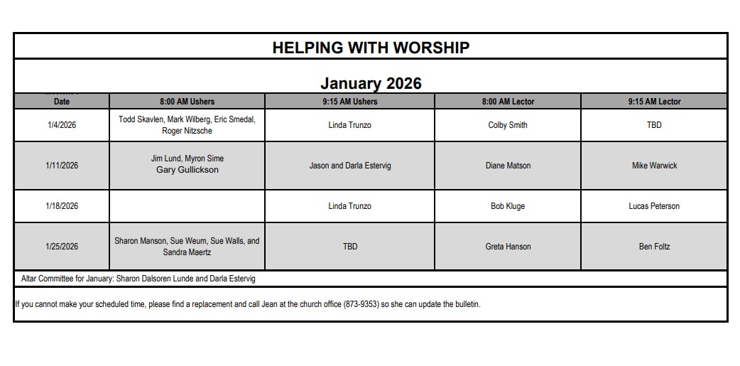 News/Schedules Click on image or words to open PDF January Calendar January Helping With Worship January Ambassador
