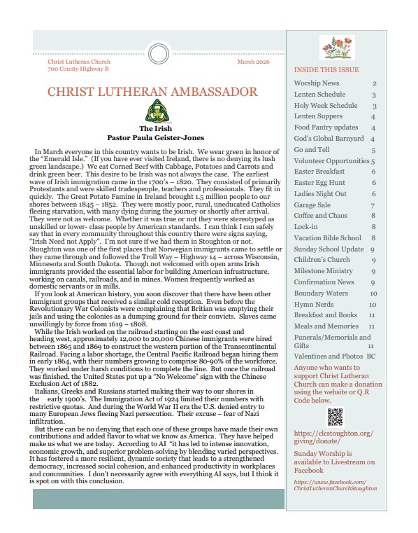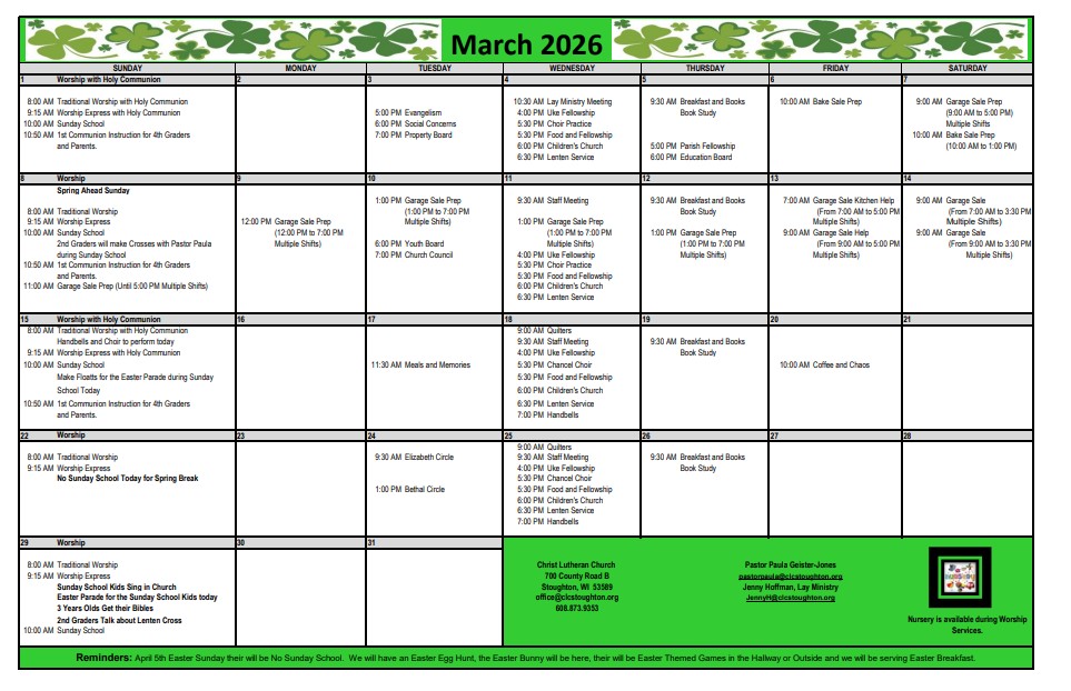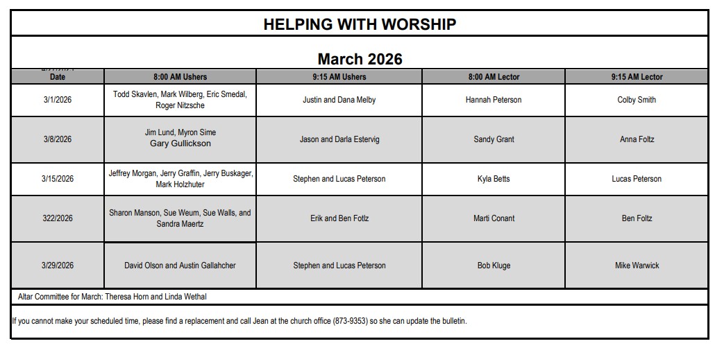 News/Schedules Click on image or words to open PDF March Calendar March Helping With Worship March Ambassador